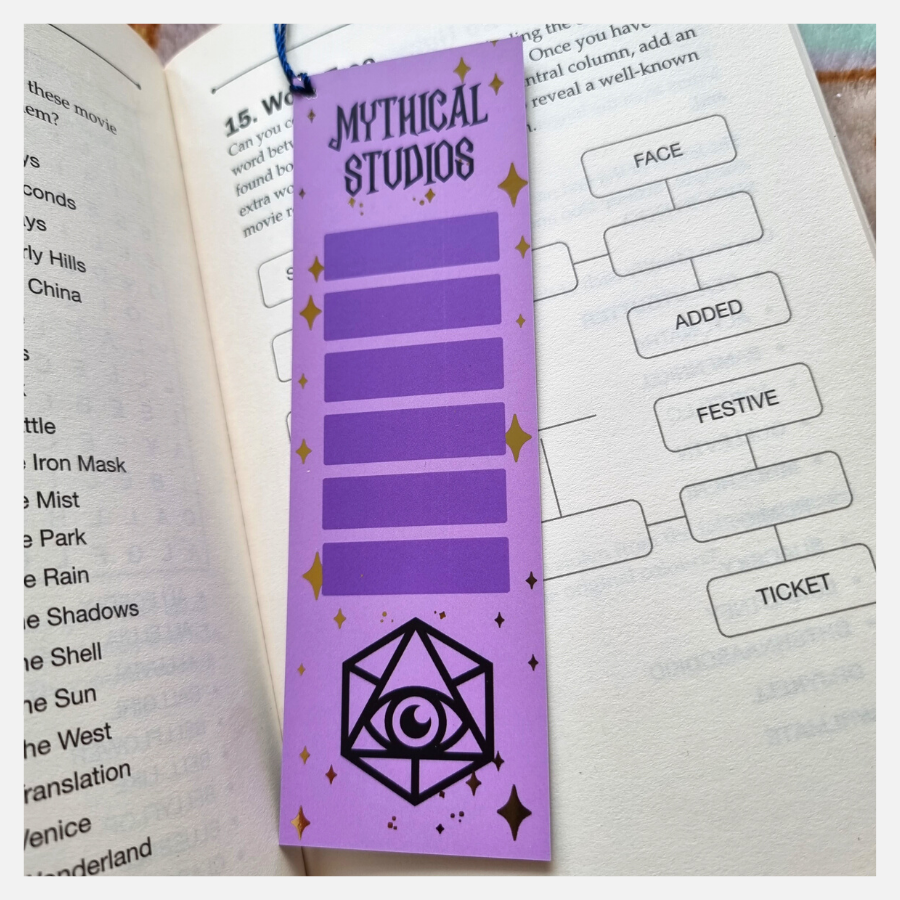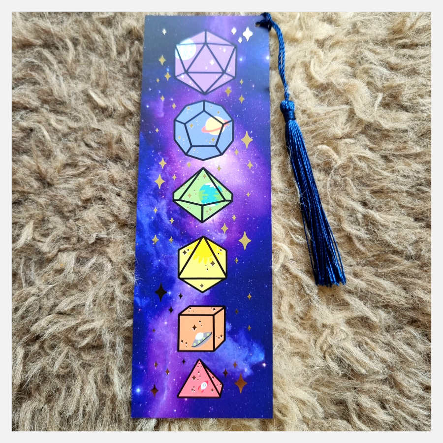 Gorgeous gold foiled bookmarks, with galaxy themed dice! Perfect for saving the pages of your game books and guides!