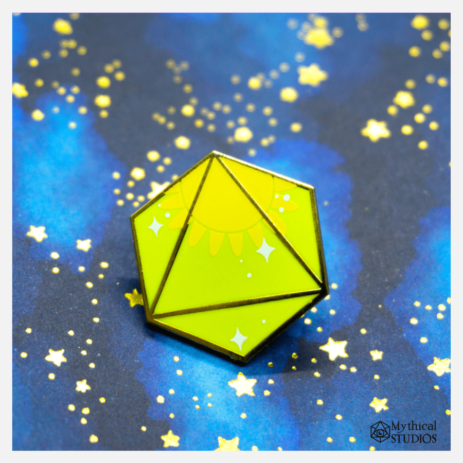 Beautiful yellow D8 dice pin, with white screen printed stars and a yellow Sun!