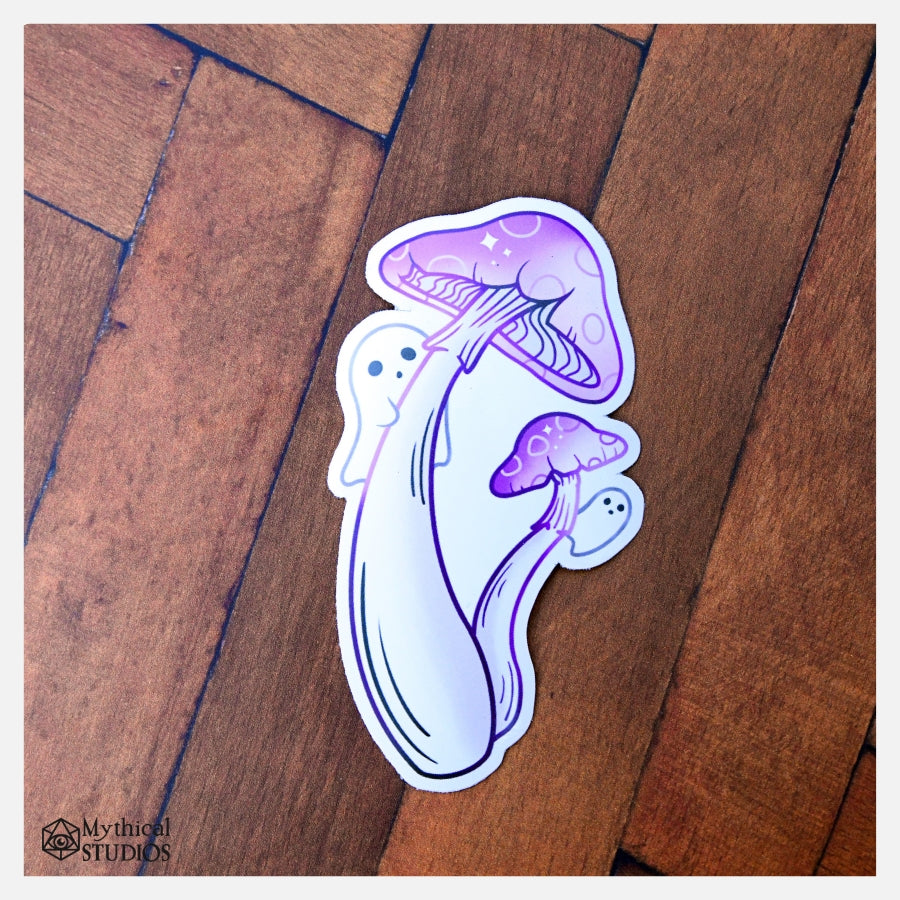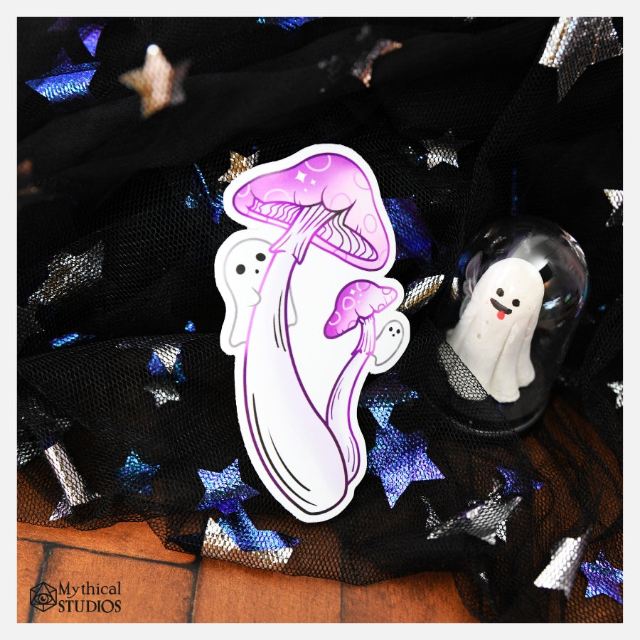 Beautiful kiss cut vinyl sticker of our ghosties haunting a pair of mushrooms!