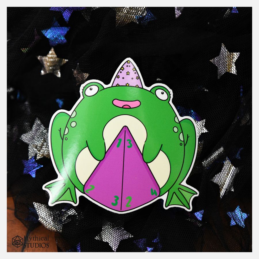 Beautiful kiss cut vinyl sticker of our magical frog, guarding his dice!